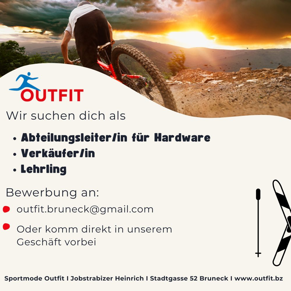 Team OUTFIT braucht Verstärkung! Wir suchen motivierte Talente in verschiedenen Bereichen! Bist du bereit, Teil unseres dynamischen Teams zu werden? Bewirb dich jetzt als Abteilungsleiter/in für Hardware, Verkäufer/in oder Lehrling. Vollzeit und Teilzeitpositionen verfügbar Schicke deine Bewerbung an outfit.bruneck@gmail.com oder besuche uns direkt im Geschäft.